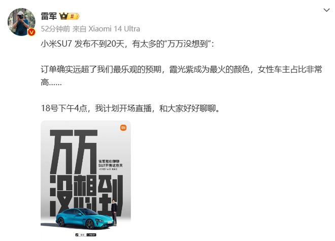 日前,雷軍曾在社交媒體透露,小米SU7發佈不到20天,訂單遠超最樂觀預期,同時開發過程中有許多“出乎意料”的發現和創新,他希望借這次直播的機會,與粉絲們深入交流自小米SU7上市以來的種種心得。