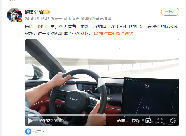 魏建軍則表示他在長城試驗場的高環上,將小米SU7開到了242km/h,稱雷軍僅用三年造出了一輛優秀的好車,魏建軍還打趣邀請雷軍到長城試驗場秀一把漂移。