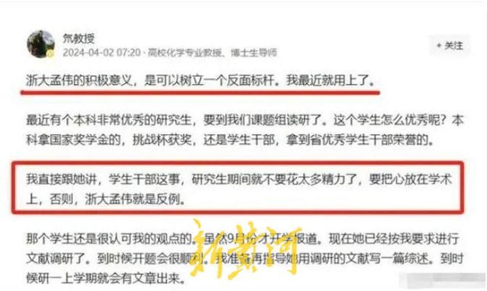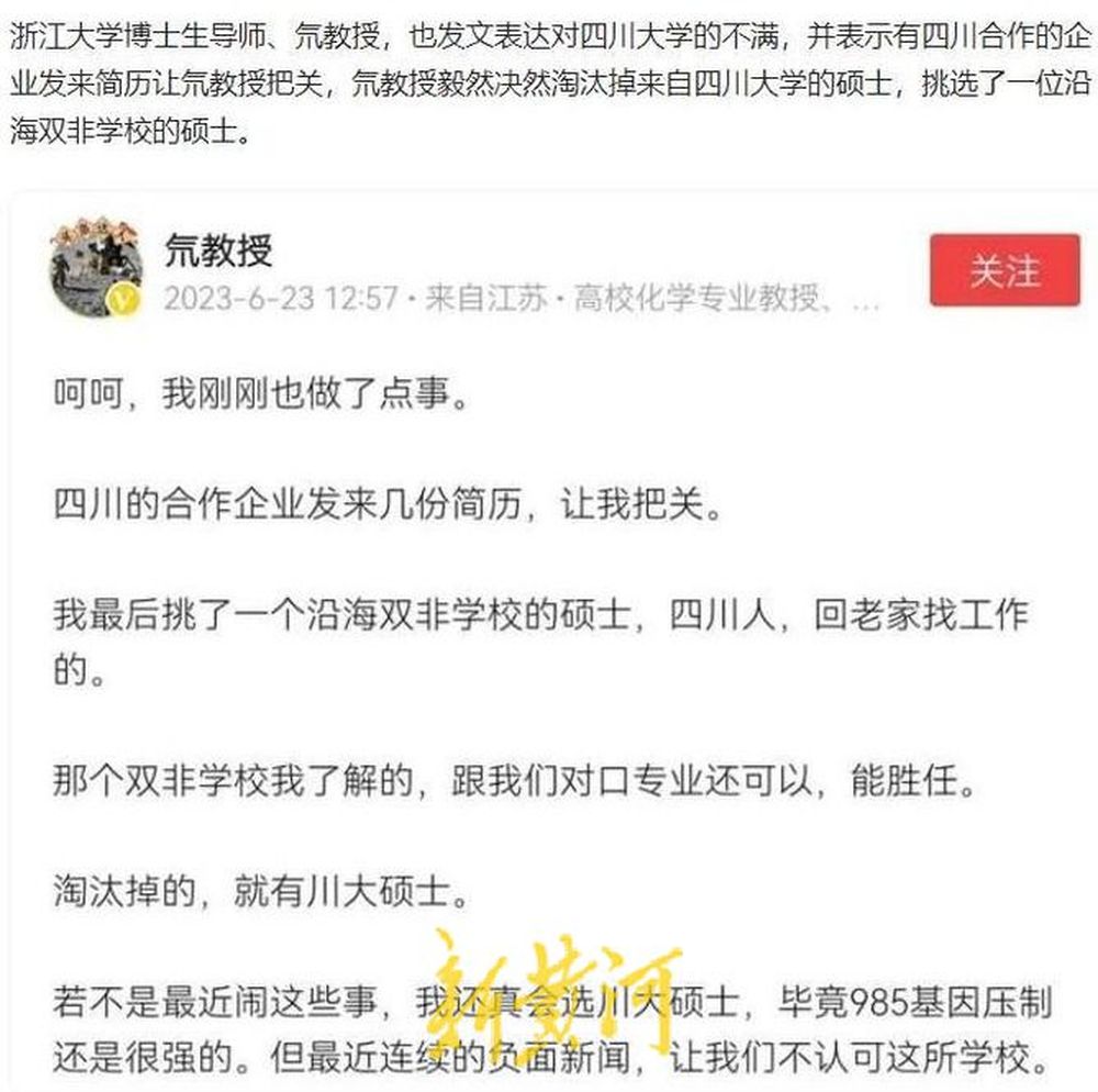 “氘教授”在社交平台上的相關資料顯示,他疑似為浙江大學化學系教授、博士生導師。記者查詢其他有關“氘教授”網絡截圖發現,“氘教授”此前經常對一些熱點新聞事件進行點評,比如2023年6月曾發文,表達對四川大學的不滿,並表示有四川合作的企業發來簡歷讓氘教授把關,氘教授毅然決然淘汰掉來自四川大學的碩士,挑選了一位沿海雙非學校的碩士。“氘教授”的不少言論此前都在網上引發過不小爭議,不少自媒體博主發文時也將其身份寫為“浙江大學博士生導師、氘教授”。