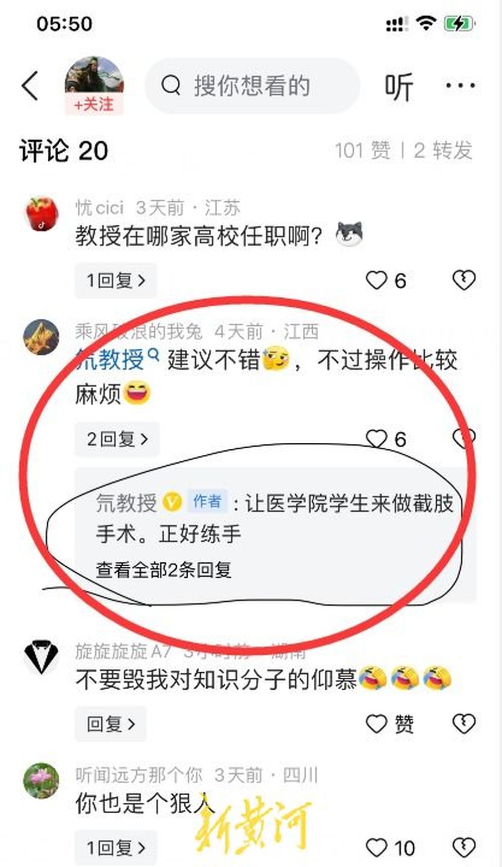 據此前網友轉發和截屏的相關資料顯示,4月9日,“氘教授”在多個社交平台發表極端言論。言論一經發布,受到了許多網友的批評和舉報。網友在其言論後面評論:“不要毀我對知識分子的仰慕”“這是怎樣的扭曲心理,才能説出這種話”“這樣的教授,真的能教好學生嗎”“這種極端恐怖暴力言論竟然來自一個大學教授”。