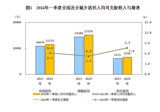 2024年一季度全國及分城鄉居民人均可支配收入與增速圖 圖自:國家統計局網站