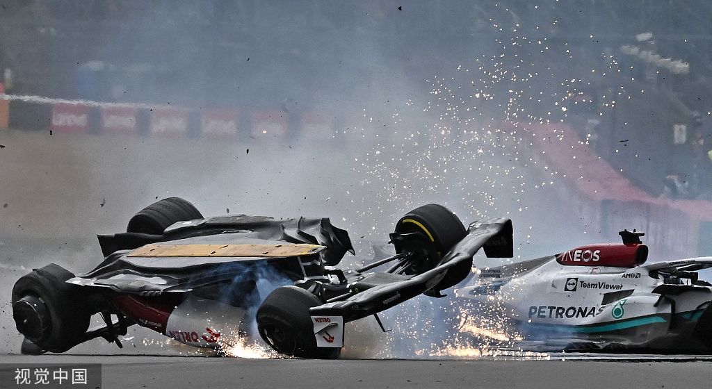 2022年7月3日,英國,2022F1英國大獎賽銀石站正賽賽況。周冠宇發車後捲入事故被撞翻車。(圖源:視覺中國)