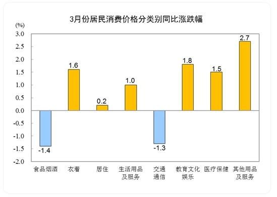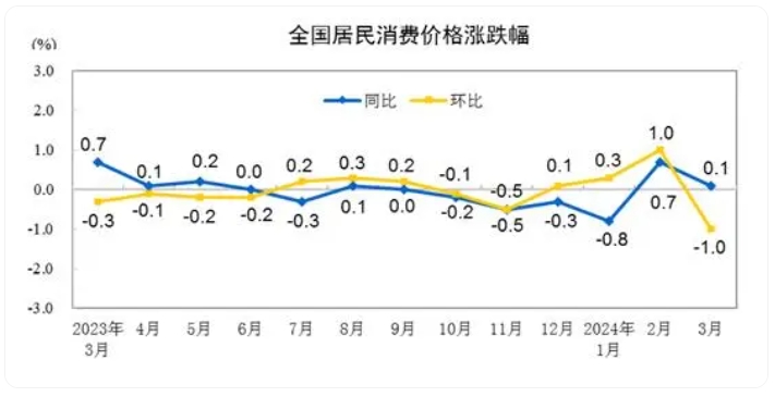 其次,從物價方面看,全世界現在都處在高通脹中,2023年全球平均通脹率為6.9%。而我國2024年3月CPI同比上漲0.1%,環比下降1.0%,一季度CPI同比持平。