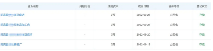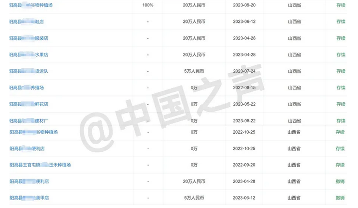 記者查詢到,**一位村支書名下注冊了23家市場主體,**只有3家是2022年前實際運營的合作社,其餘20家有個體工商户、合作社及公司,涉及鞋店、服裝店、水果店、貨運隊、養殖廠、水產店、鮮花店、建材廠,兩家便利店及一家美甲店。