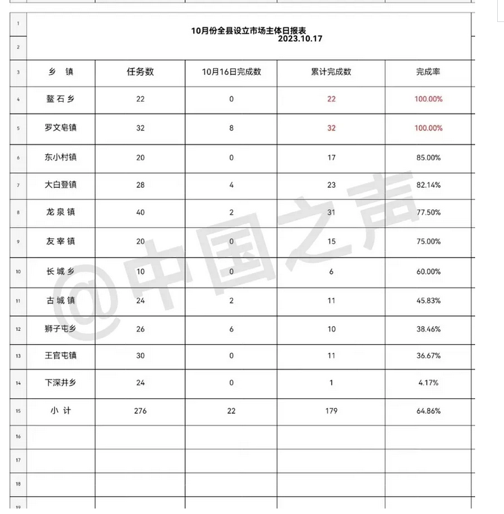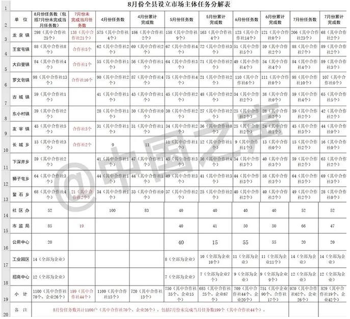 基層幹部:本來註冊是自然人的自願行為,但註冊量少,要完成“市場主體倍增”的數量任務,縣裏給鄉鎮、街道攤派,合作社辦理多少個,公司辦理多少個,每個月都有任務。鄉鎮沒法只能給村裏攤派,村支書只好找人註冊沒有實際營運的執照,這個月剛辦完,下個月任務又來了。每個月都要通報,完不成挨批評。