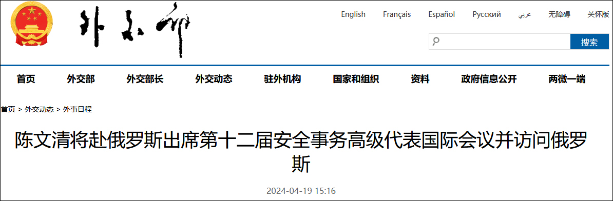 陳文清將赴俄羅斯出席第十二屆安全事務高級代表國際會議並訪問俄羅斯 guancha 2024-04-19 據外交部網站4月19日消息,外交部發言人林劍宣佈:中共中央政治局委員、中央政法委書記陳文清將於4月20日至28日應邀赴俄羅斯出席第十二屆安全事務高級代表國際會議並訪問俄羅斯。