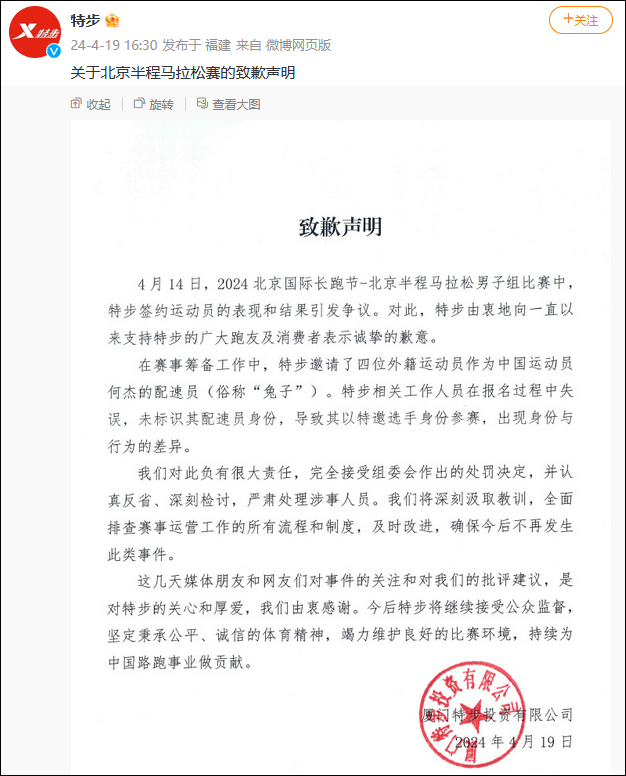 聲明稱,4月14日,2024北京國際長跑節-北京半程馬拉松男子組比賽中,特步簽約運動員的表現和結果引發爭議。對此,特步由衷地向一直以來支持特步的廣大跑友及消費者表示誠摯的歉意。