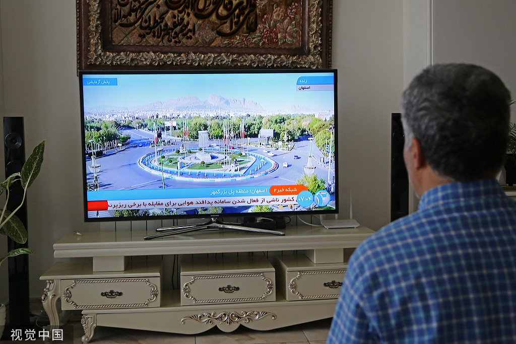 4月19日,傳出爆炸後,伊朗德黑蘭一名男子在看電視報道 圖片來源:視覺中國