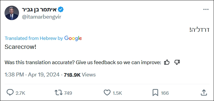 另一方面,以色列國家安全部部長、極右翼政治人士本-格維爾在X發帖,帖文只一個單詞:“軟弱無能!”(觀察者網注:原文為希伯來語,《以色列時報》建議將其譯為Lame,路透社等則將其譯為Feeble)本-格維爾過去一週都在呼籲以色列嚴厲回應伊朗的空襲。