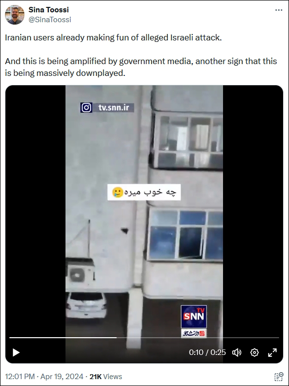 而在社交媒體上,報道稱,包括一些與伊朗軍方有關的賬號在內的用户們,嘲笑以色列的襲擊是對伊朗上週日(14日)向以色列發射約300枚導彈和無人機的微不足道的回應。一個女孩在窗邊向外扔出紙飛機的視頻被伊朗網民熱轉,他們將其與以色列的襲擊相提並論。視頻中,當紙飛機擊中建築外牆時,她笑了起來。