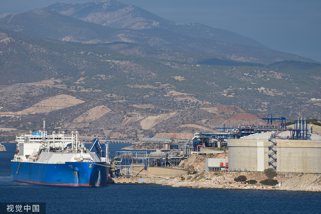 當地時間2022年10月4日,希臘雅典,裝載着來自俄羅斯波羅的海沿岸波爾託瓦亞液化天然氣新工廠的第一批貨物的Pskov液化天然氣油輪在Revithoussa設施卸貨。(圖源:視覺中國)