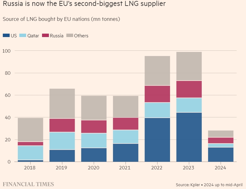 歐盟液化天然氣各供應國進口量,2024年數據截止到4月中旬,紅色為俄羅斯,深藍色為美國,淺藍色為卡塔爾,灰色為其他(圖源:英國《金融時報》,單位:百萬噸)
