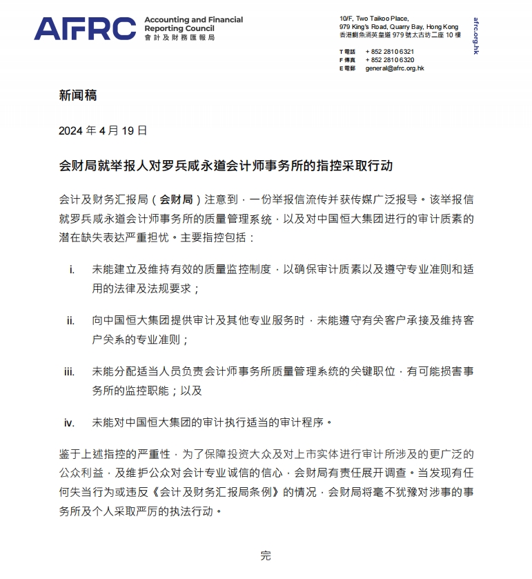 主要指控包括:未能建立及維持有效的質量監控制度,以確保審計素質以及遵守專業準則和適用的法律及法規要求;向中國恒大集團提供審計及其他專業服務時,未能遵守有關客户承接及維持客户關係的專業準則;未能分配適當人員負責會計師事務所質量管理系統的關鍵職位,有可能損害事務所的監控職能;以及未能對中國恒大集團的審計執行適當的審計程序。