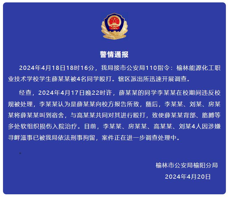 對此,據“榆陽公安”消息,陝西榆林市公安局榆陽分局4月20日凌晨通報稱,18日18時16分,榆陽分局接市公安局110指令:榆林能源化工職業技術學校學生薛某某被4名同學毆打。轄區派出所迅速開展調查。