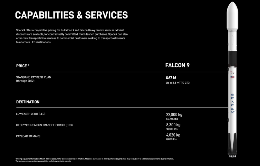 SpaceX官網給出的獵鷹9號火箭將衞星送至地球同步轉移軌道的報價,6700萬美元對應運力為5.5噸。巧合的是,我國長征三號乙火箭執行同類任務的運力也是5.5噸,因此兩者具有可比性。