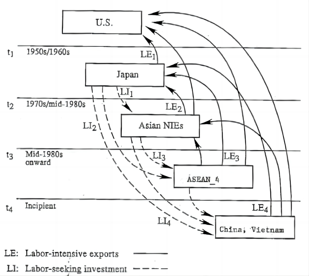以東南亞區域間貿易為基礎提出的雁行模式,最早可以追溯到日本經濟學家赤松要在太平洋戰爭時期提出的經濟發展理論。上世紀六七十年代,經過其學生小島清的總結和發展,形成了我們今天熟知的雁行模式,亦即以日本為領頭雁,通過產業梯度轉移來實現區域經濟發展:先是亞洲四小龍,然後是四小虎、中國等。這一模式之所以很有名氣,自然不只是因為經濟學家的貢獻。