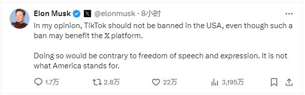 “在我看來,TikTok 不應該在美國被禁止,儘管這樣的禁令可能會讓X平台受益”,馬斯克在其“X”賬號上寫道,“(封禁TikTok)的做法違背了言論和表達自由,而這不是美國所代表的價值觀。”