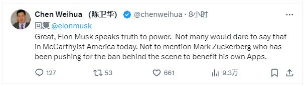 而馬斯克的上述言論,獲得了中國記者、《中國日報》歐盟分社社長陳衞華的點贊,“太好了,馬斯克敢説真話”。