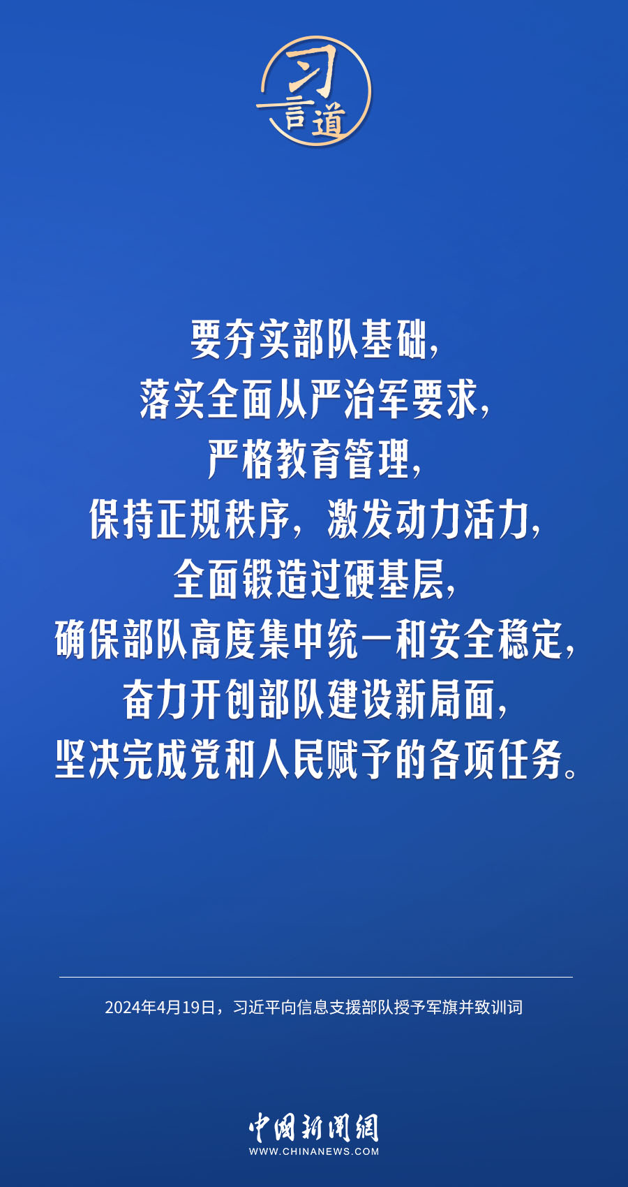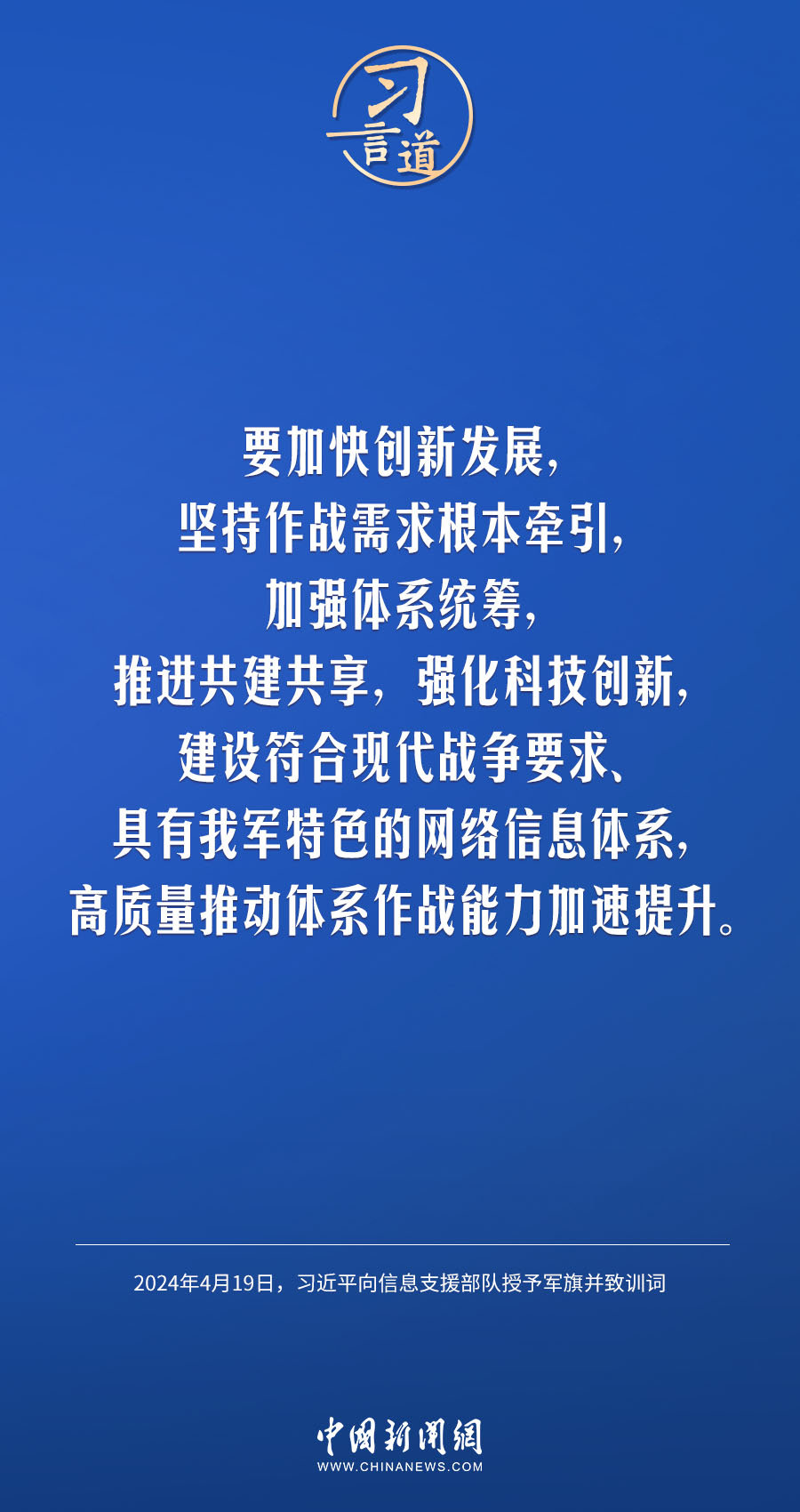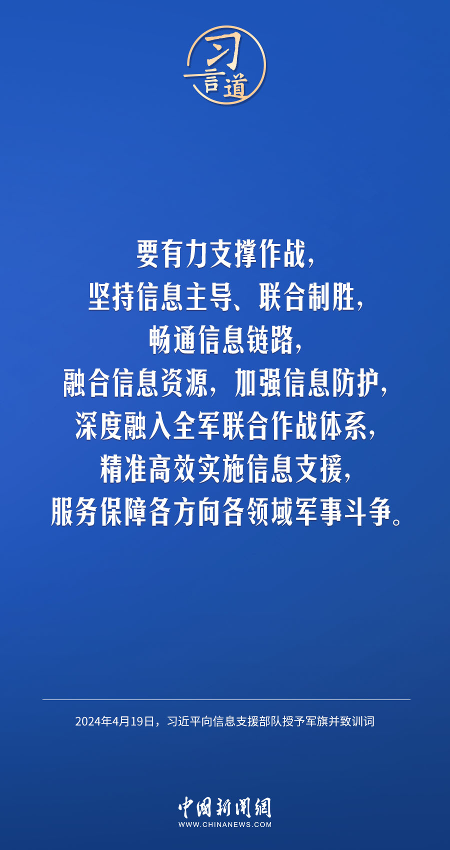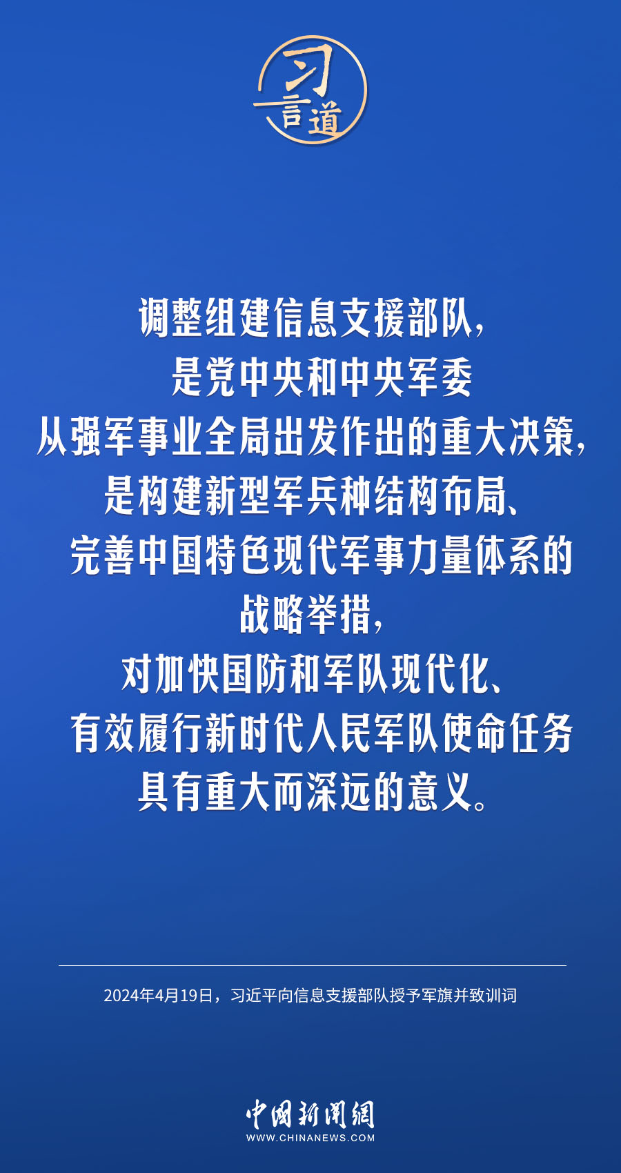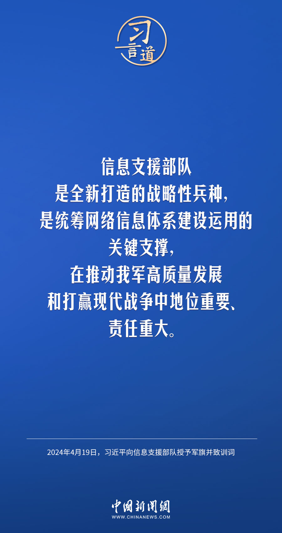 習言道|信息支援部隊是全新打造的戰略性兵種 guancha 2024-04-20 中國人民解放軍信息支援部隊成立大會19日在北京八一大樓隆重舉行。中共中央總書記、國家主席、中央軍委主席習近平向信息支援部隊授予軍旗並致訓詞,代表黨中央和中央軍委向信息支援部隊全體官兵致以熱烈祝賀。他強調——