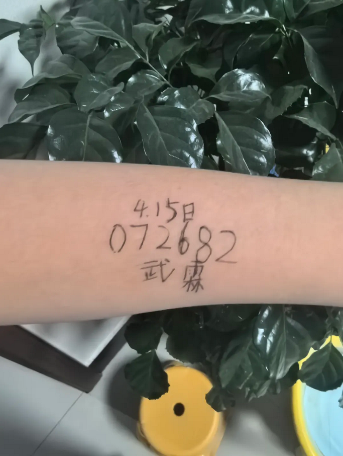 武霖犧牲後,他12歲的外甥在胳膊上默默寫下了舅舅犧牲的日期和警號。