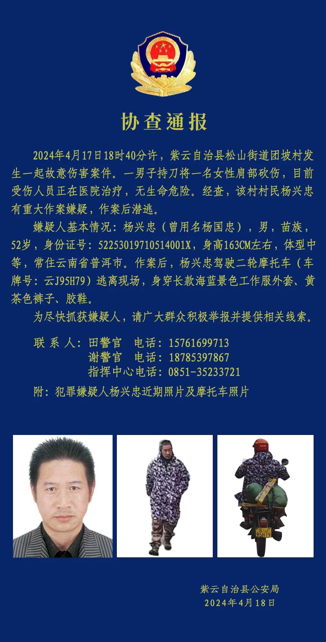 此前,貴州紫雲公安於4月18日發佈協查通報,4月17日18時40分許,紫雲自治縣松山街道團坡村發生一起故意傷害案件。一男子持刀將一名女性肩部砍傷,目前受傷人員正在醫院治療,無生命危險。經查,該村村民楊興忠有重大作案嫌疑,作案後潛逃。為儘快抓獲嫌疑人,請廣大羣眾積極舉報並提供相關線索。