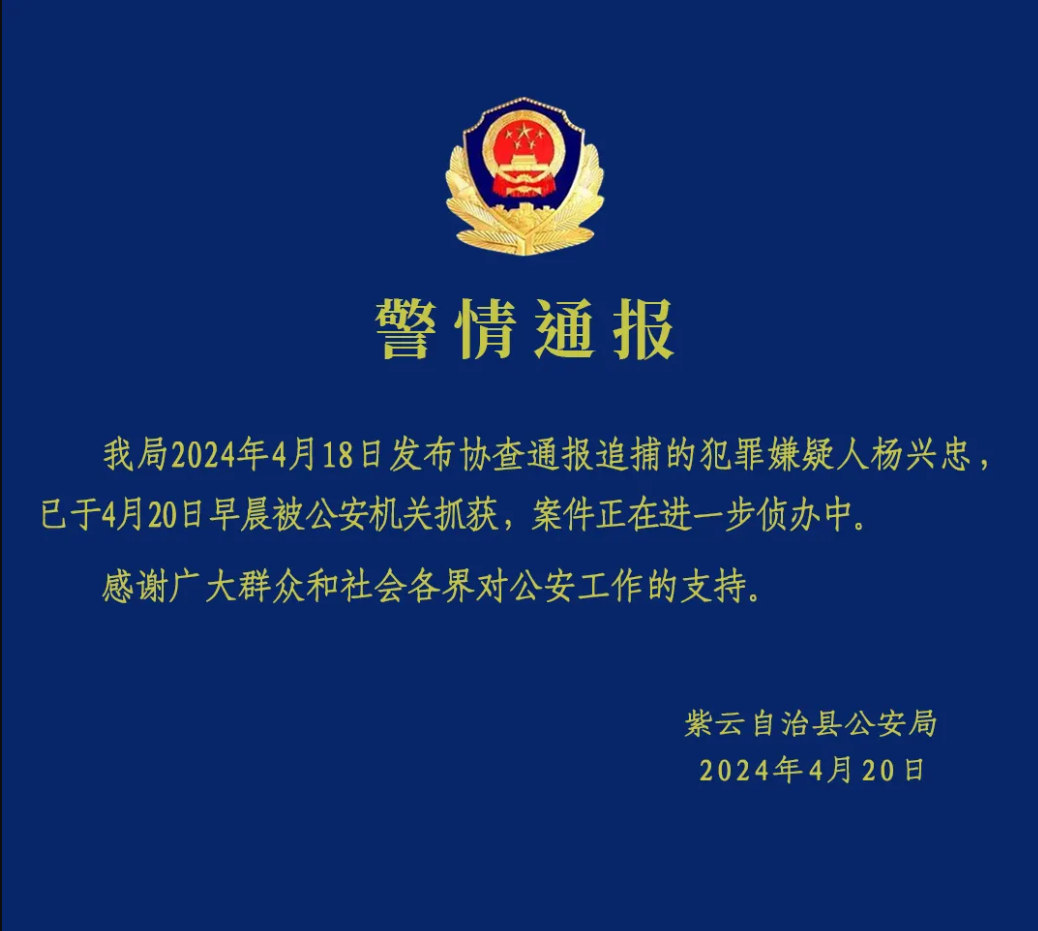 據微信公眾號“紫雲公安”20日消息,貴州紫雲自治縣公安局發佈通報,持械砍傷5歲女童的犯罪嫌疑人楊興忠於20日早晨被抓獲。