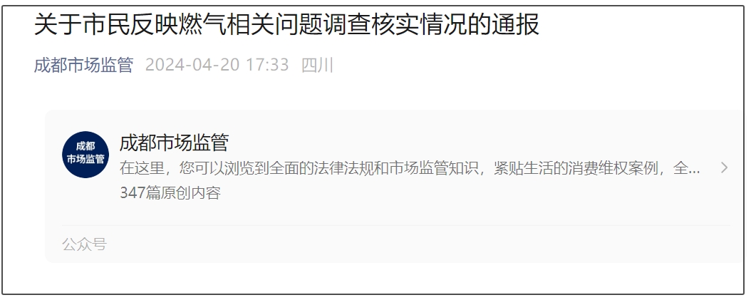 微信公眾號“成都市場監管”發佈關於市民反映燃氣相關問題調查核實情況的通報: