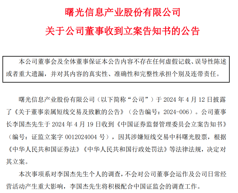4月19日晚間,中科曙光公告披露,該公司董事長李國傑於4月19日收到了《中國證券監督管理委員會立案告知書》,因李國傑涉嫌短線交易中科曙光股票,根據《中華人民共和國證券法》《中華人民共和國行政處罰法》等法律法規,決定對其立案。