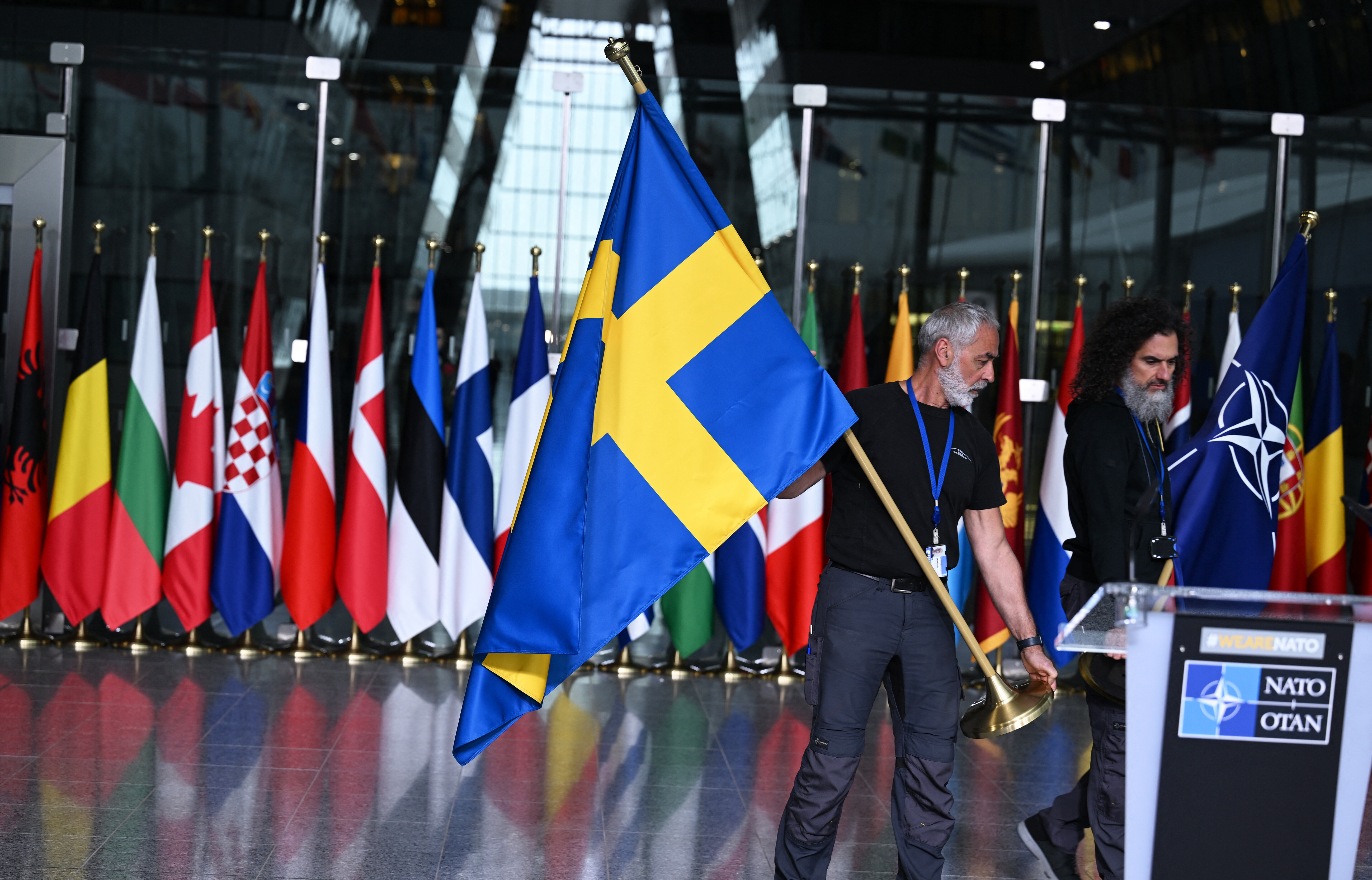 當地時間2024年3月11日,比利時布魯塞爾,北約總部舉行升旗儀式,紀念瑞典正式加入北約(圖片來源:IC photo)
