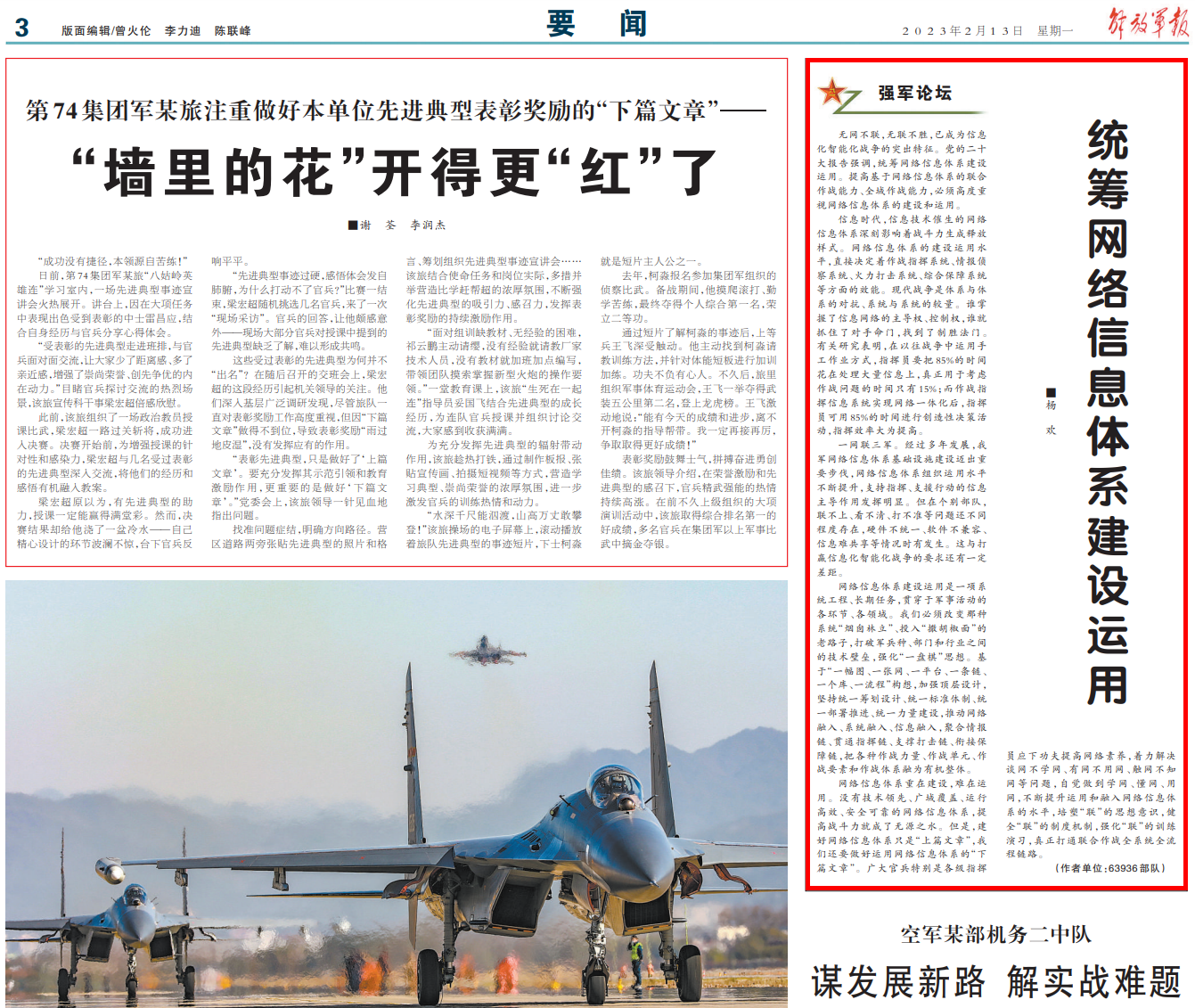 在2023年2月13日《解放軍報》第3版“強軍論壇”板塊中,刊載了一篇名為《統籌網絡信息體系建設運用》的稿件。該文深刻指出:“在個別部隊,聯不上、看不清、打不準等問題還不同程度存在,硬件不統一、軟件不兼容、信息難共享等情況時有發生。這與打贏信息化智能化戰爭的要求還有一定差距……我們必須改變那種系統‘煙囱林立’、投入‘撒胡椒麪’的老路子,打破軍兵種、部門和行業之間的技術壁壘,強化‘一盤棋’思想”。