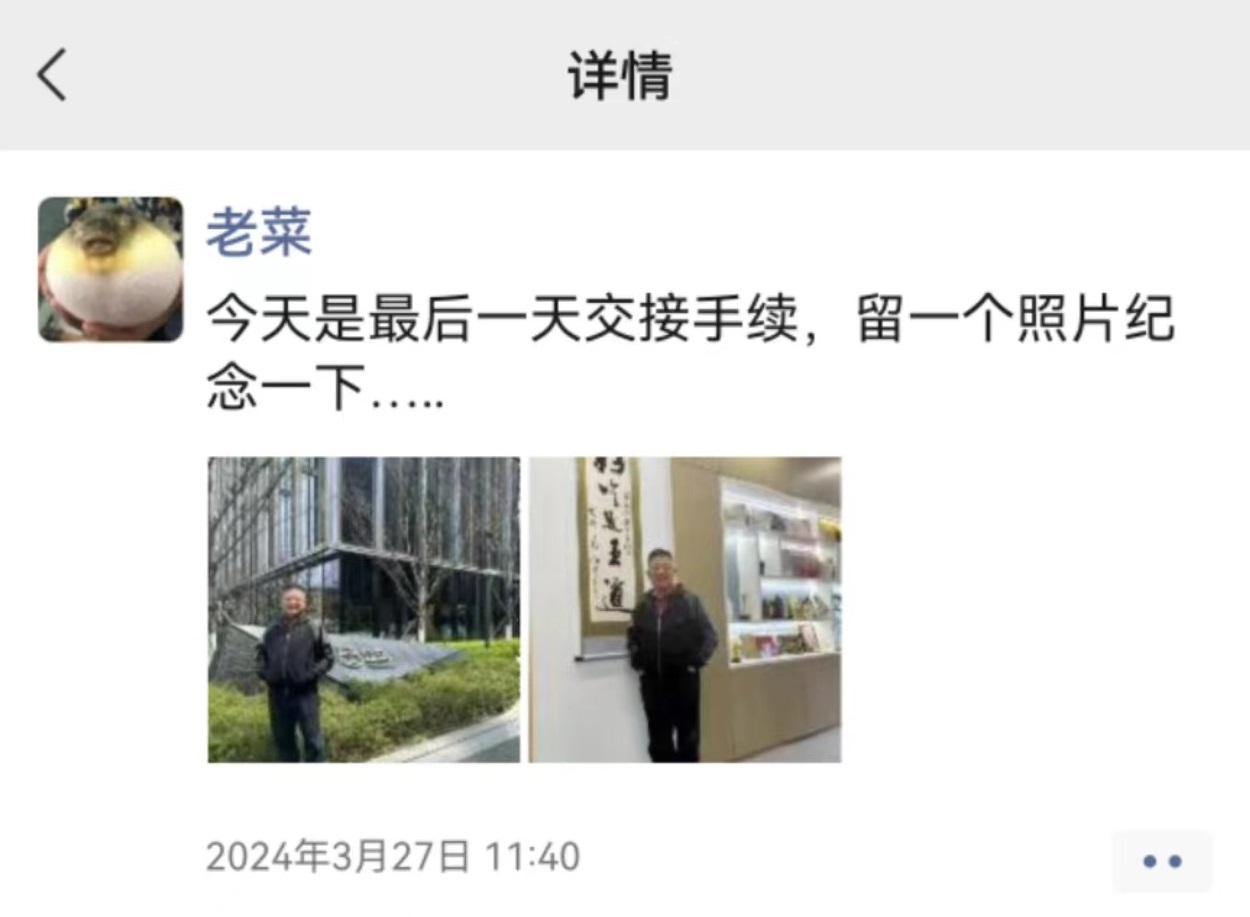 侯毅此前一條朋友圈發佈於3月27日:“今天是最後一天交接手續,留一個照片紀念一下……”