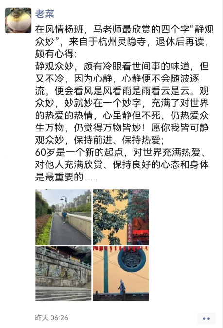 在風情楊班,馬老師最欣賞的四個字“靜觀眾妙”,來自於杭州靈隱寺,退休後再讀,頗有心得: