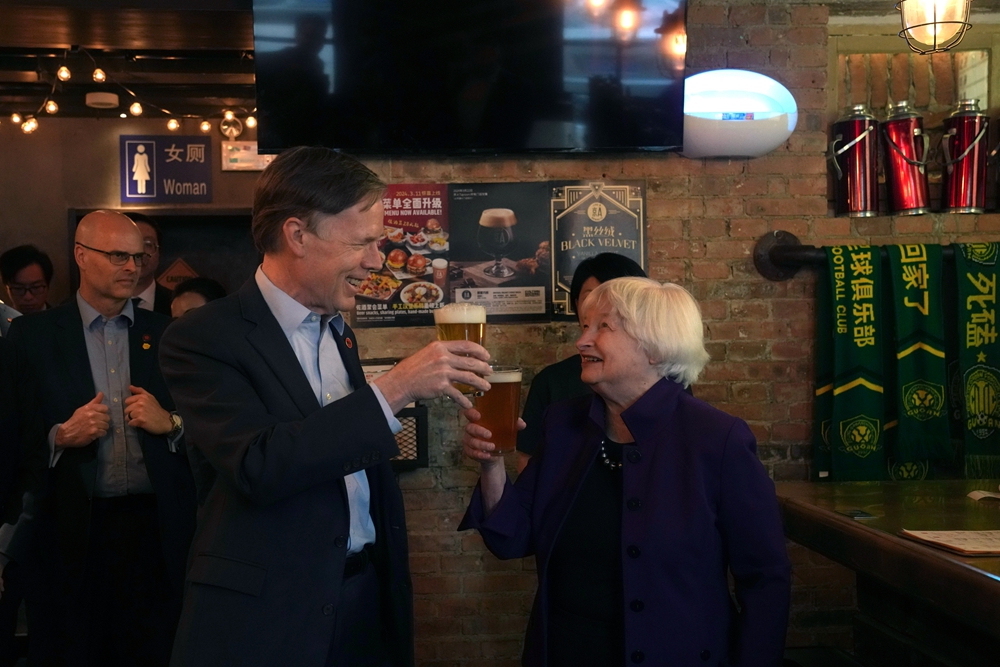 耶倫訪華期間,與美國駐華大使伯恩斯一起在北京三里屯喝精釀啤酒。(圖片來源:ICphoto)