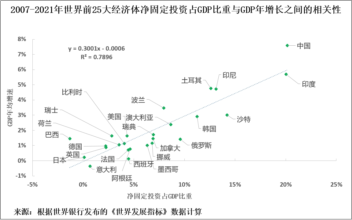 為説明這一點,圖1呈現的是自2007年國際金融危機爆發以來至2021年全球前25大經濟體淨固定投資與GDP增長之間的相關性。這些經濟體合起來佔世界GDP的83%,因此完全主導了世界經濟發展。它們在這個特徵上的相似性是壓倒性的。全球前25大經濟體淨固定投資佔GDP比重與GDP增長之間的相關性高達驚人的0.89,R平方關係為0.79。在現實世界中存在近乎完美的相關性。