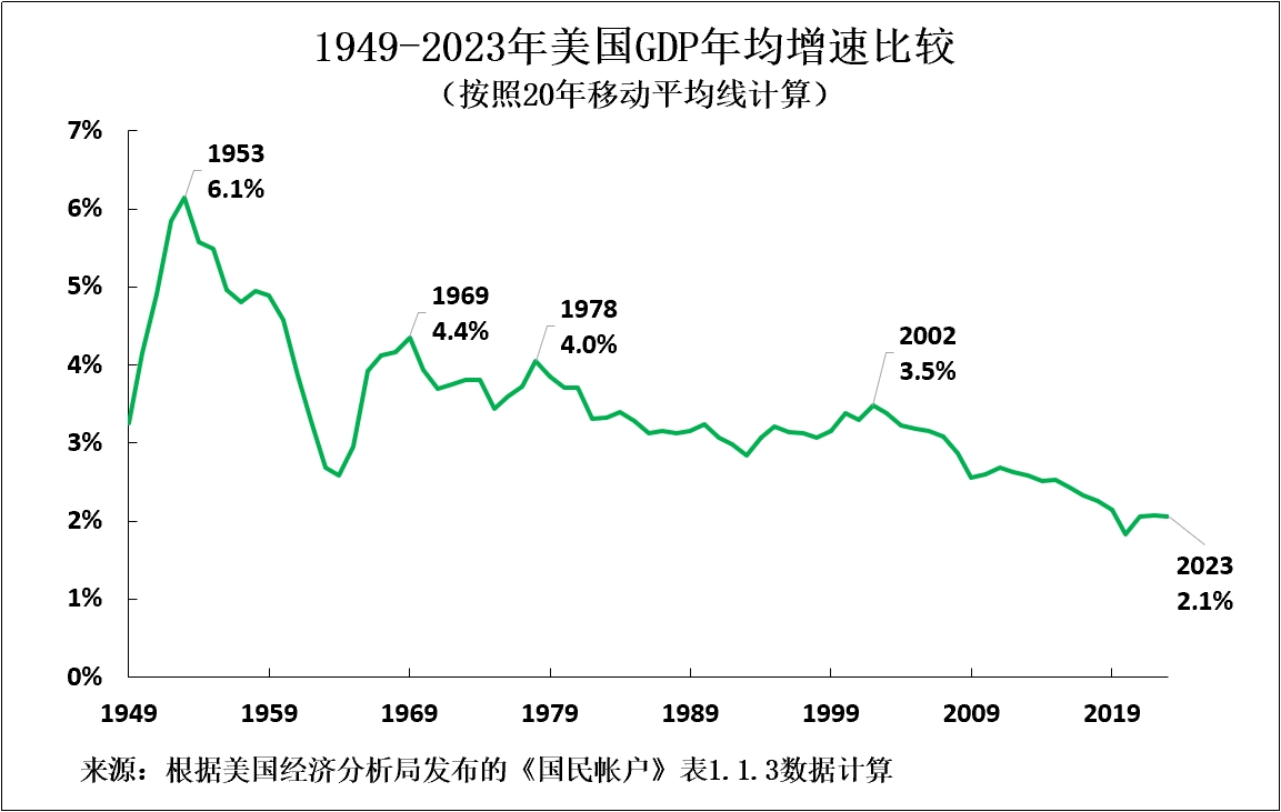 這種經濟發展趨勢所帶來的實際後果顯而易見。正如上文分析所示,隨着美國淨固定投資佔GDP比重下降,其經濟增速也隨之下降。圖4反映了這一過程:隨着美國淨固定投資佔GDP比重下降,美國GDP長期年均增速亦隨之放緩,從1953年的6.3%降至1969年的4.4%、1978年的4.0%、2002年的3.5%和2023年的2.1%。由於美國不願意採取措施提高其淨固定投資佔GDP比重,上述事實關係意味着它不可避免地陷入緩慢增長模式,並且在為發展新質生產力的融資方面越來越困難。