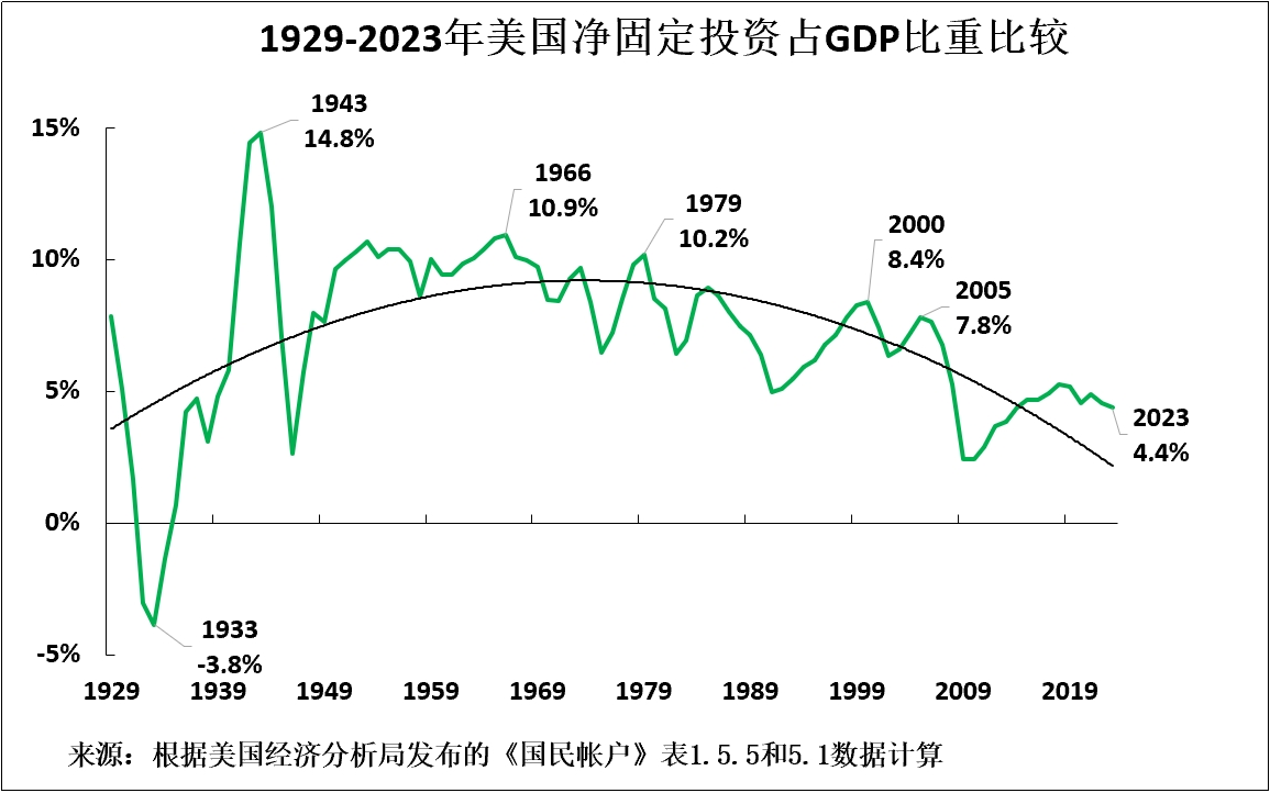 使這種情況更加尖鋭的是,美國的局勢正在惡化,而非改善。圖3有助於瞭解美國上個世紀經濟的起落。可以很容易地看出,在美國從大蕭條、二戰和二戰後經濟繁榮中走出來的巔峯時期,美國淨固定投資佔GDP比重實際上達到了上述更快經濟增長時期的水平。1943年,在美國二戰巔峯期,即其整個歷史上經濟增長最快的時期,美國淨固定投資佔GDP比重升至14.8%。1966年,在戰後繁榮時期,美國淨固定投資佔GDP比重為10.9%。但到2023年,在經歷了近60年的下降後,美國淨固定投資佔GDP比重僅為4.4%。由於以上分析的過程,除非美國扭轉這一趨勢,否則它無法恢復快速經濟增長,也無法擁有資源在越來越多的新興產業中成功贏得競爭。