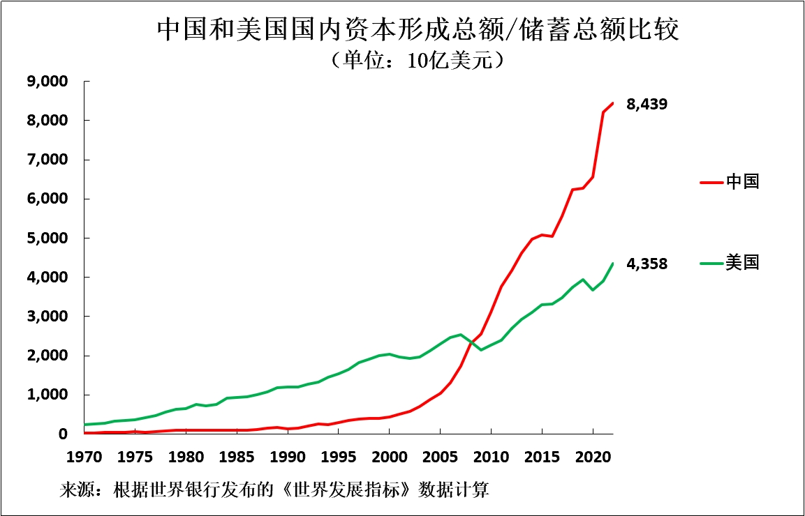 在每個主要經濟體中,絕大多數儲蓄/資本形成都來自本國經濟。美國的不同尋常之處在於,2023年它使用了8450億美元的國外資金,佔其GDP的3.1%,為其投資融資,但這仍然意味着美國84%的固定投資是由國內提供資金。因此,與中國相比,美國固定投資水平較低,反映了美國國內資本形成總額/儲蓄水平較低——截至2022年的國際可比數據顯示,中國國內資本形成總額/儲蓄總額佔GDP比重為47.0%,美國則為17.1%。