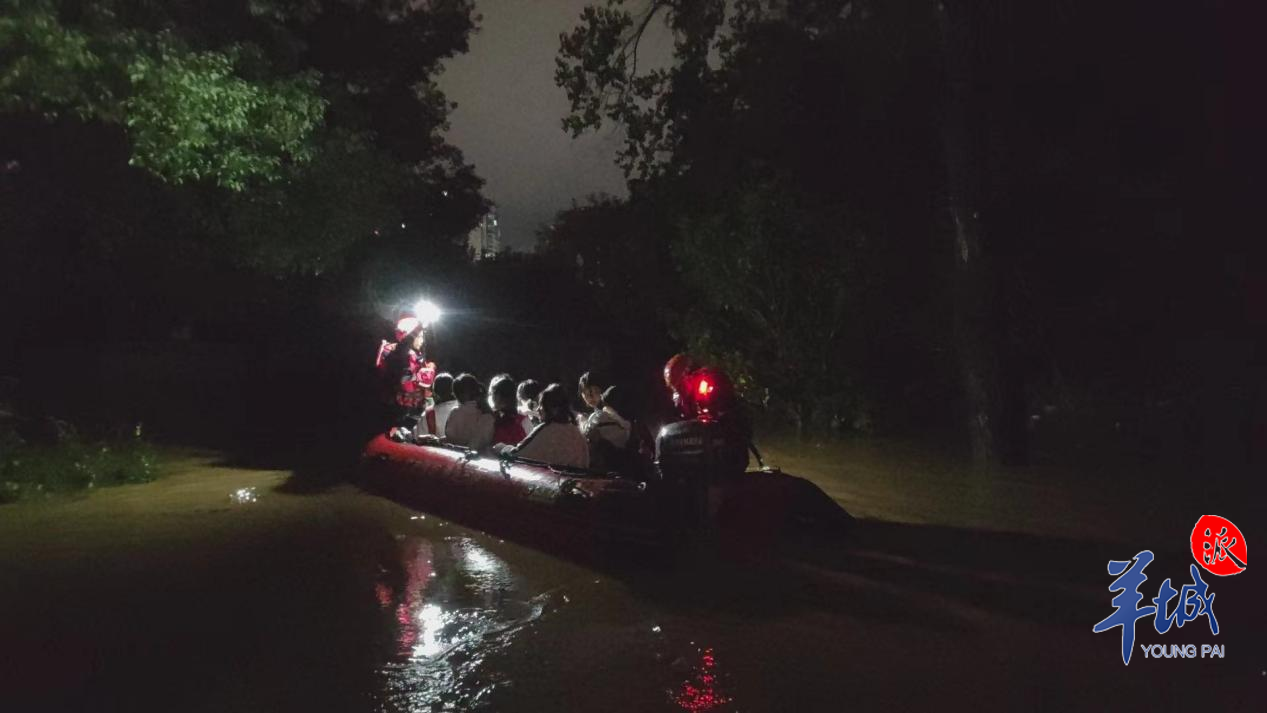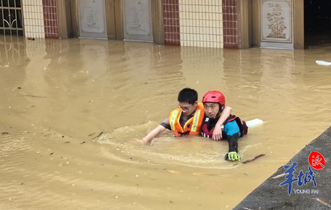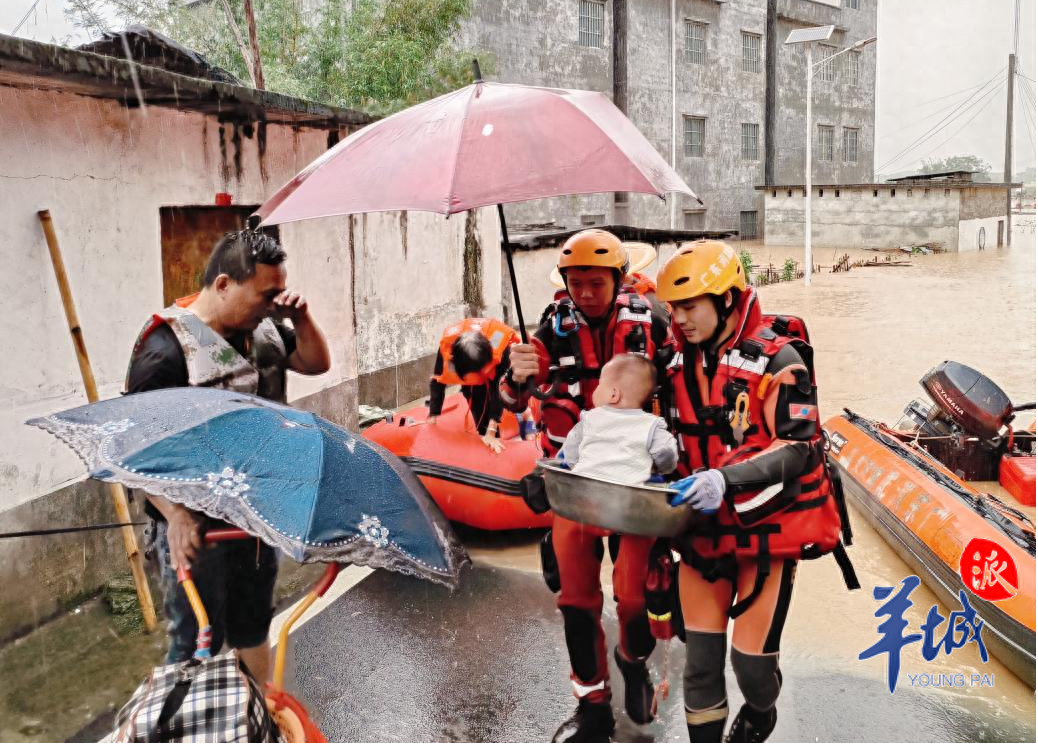 與此同時,封開縣金裝鎮安靖村大面積發生積澇,部分居民樓已淹過半層樓,有羣眾被困家中。救援人員冒着積水深入被困地點,將一名幼童放在盆中,慢慢移動,轉移到橡皮艇上後,和被困的羣眾一同離開深水區。