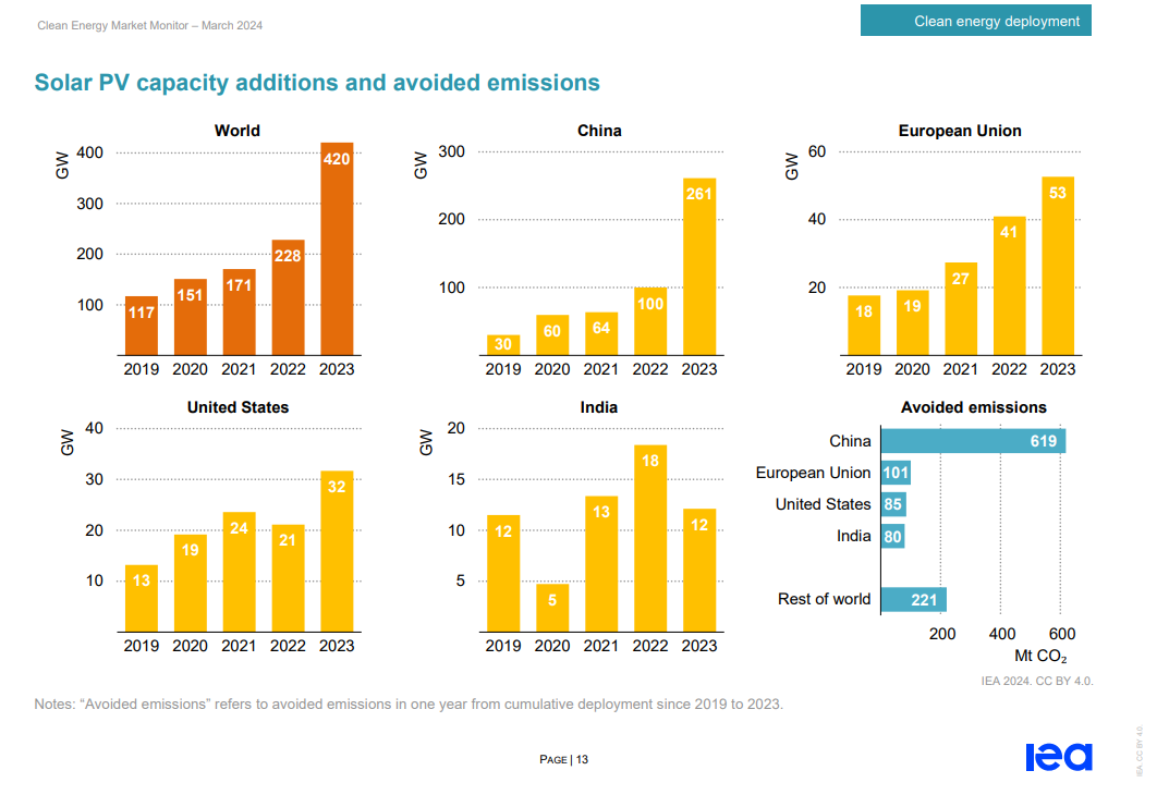 據國際能源署(IEA)今年3月發佈的報告,全球2023年太陽能光伏裝機容量達到創紀錄的420吉瓦(GW),同比上一年度上漲了約84%,其中261GW新增裝機容量部署在中國。報告認為,太陽能發電在中國國內能源市場上的競爭力得益於太陽能組件價格低廉。自2022年12月以來,太陽能組件的價格下降了約50%。