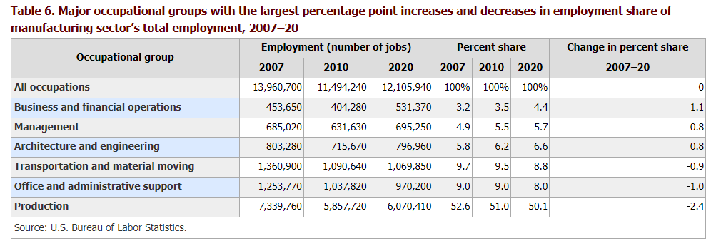 歐美製造業滑坡,最直接的例證就是製造羣體的大衰退。據美國勞工部公佈的就業和工資統計(OEWS)顯示的資料,2007年至2020年,美國就業人數增加了470萬個,即3.5%。但同期其製造業總就業人數減少了190萬個,降幅13%。其中“生產崗位”成為削減崗位的重災區,同期減少了減少了130萬個就業崗位,即17%。