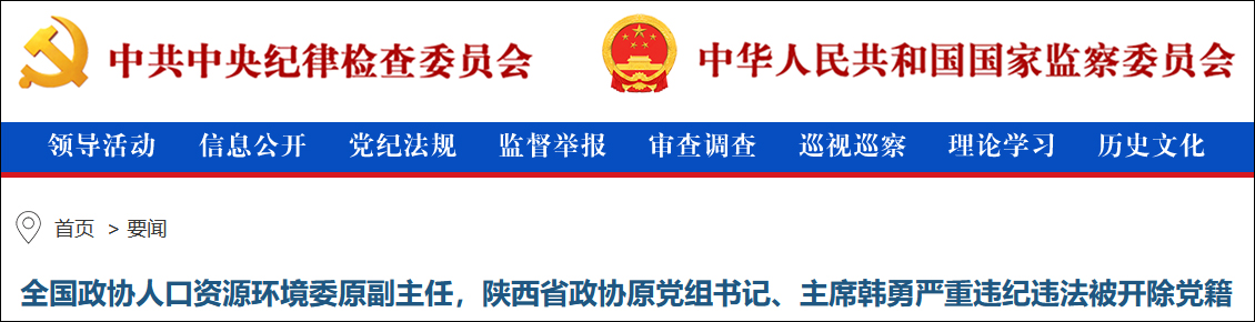 不敢擔當鬥爭,陝西省政協原黨組書記、主席韓勇被開除黨籍
