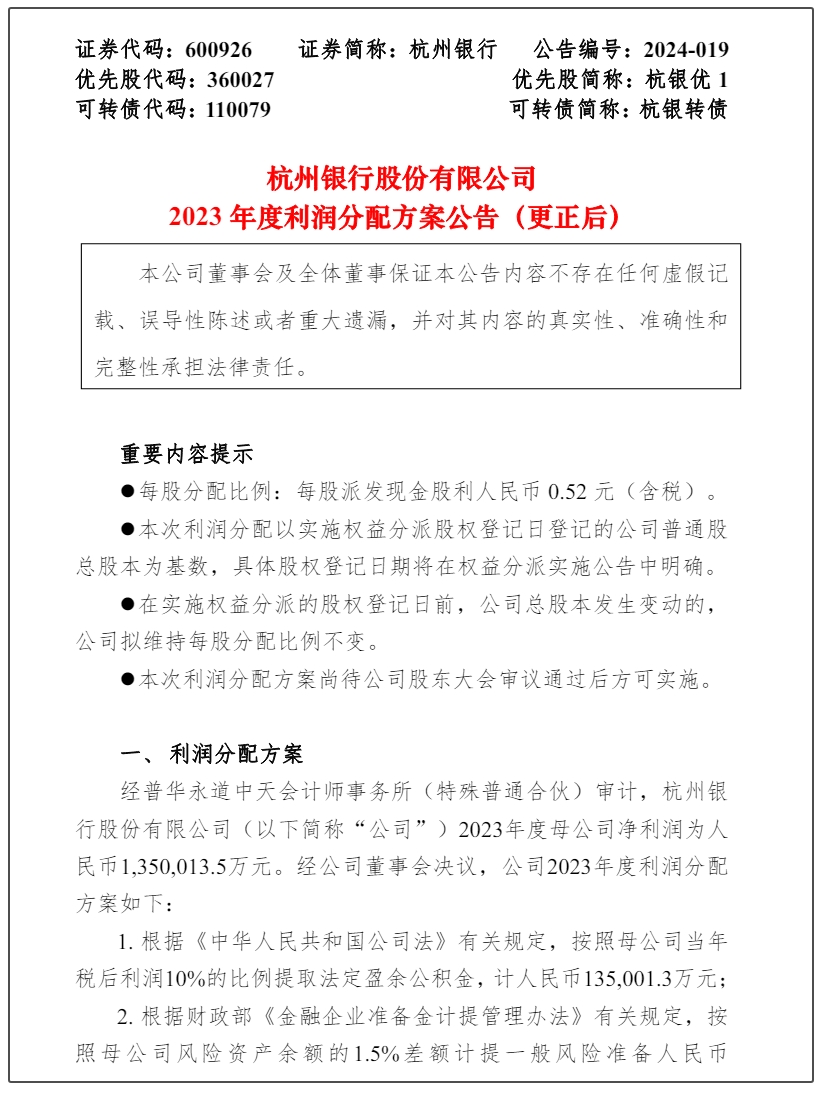 更正後的杭州銀行股份有限公司2023 年度利潤分配方案公告: