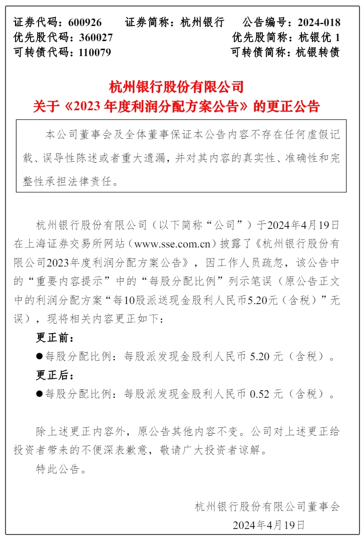 杭州銀行股份有限公司(以下簡稱“公司”)於2024年4月19日在上海證券交易所網站(www.sse.com.cn)披露了《杭州銀行股份有限公司2023年度利潤分配方案公告》,因工作人員疏忽,該公告中的“重要內容提示”中的“每股分配比例”列示筆誤(原公告正文中的利潤分配方案“每10股派送現金股利人民幣5.20元(含税)”無誤),現將相關內容更正如下: