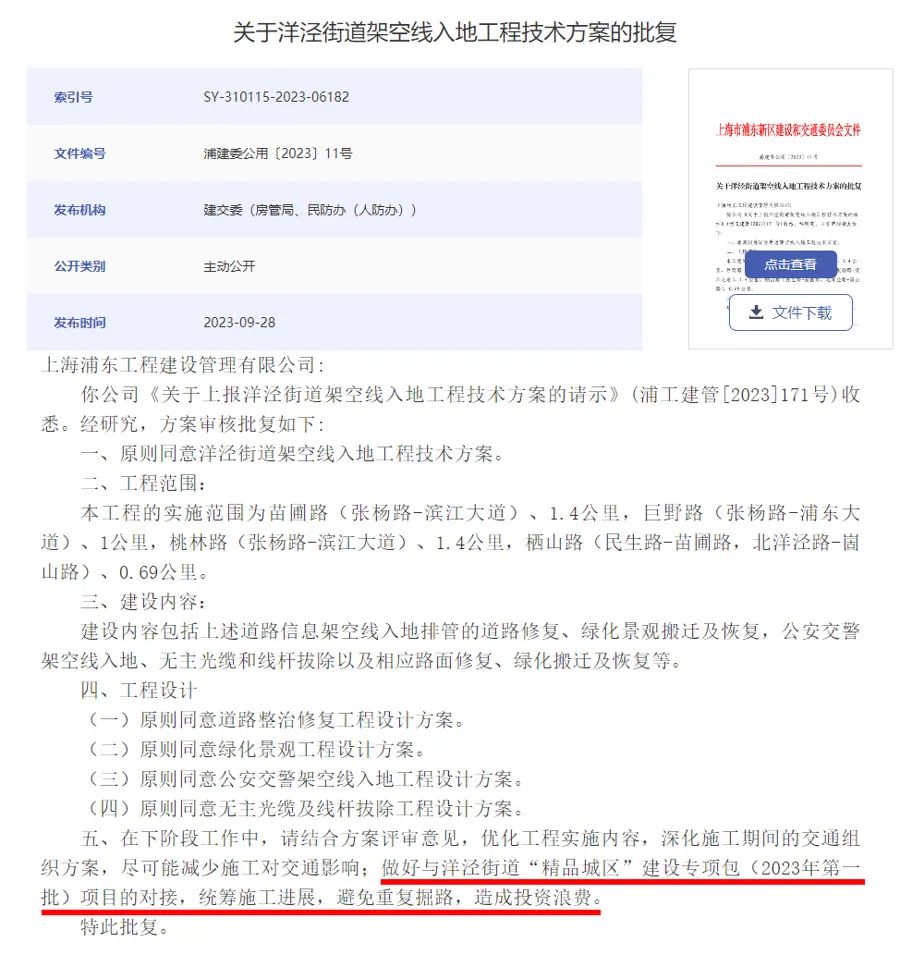 鉅野路上的施工項目,進行過統籌嗎?浦東新區政府官方網站公開了相關工程的立項和批覆文件。文件顯示,鉅野路的架空線入地工程為區級工程,浦東新區建交委去年9月批覆同意實施,施工內容為信息架空線入地排管和路面修復等;而精品城區項目則是由屬地街道5月立項,浦東新區發改委於8月底批覆同意。施工內容包括道路鋪裝、沿線建築立面提升、店招店牌改造、口袋公園建設等。由於施工時間接近,精品城區項目的立項文件中特意註明:“為避免二次開挖,擬同步實施鉅野路架空線入地改造,由區架空線指揮部統籌實施。”