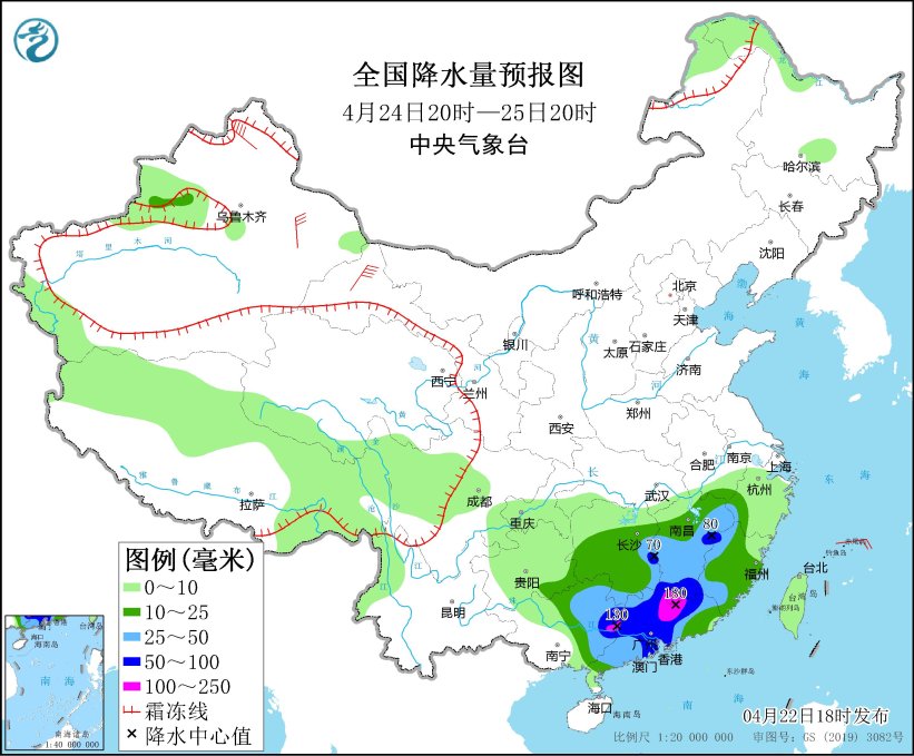 4月24日20時至25日20時,華南大部、江南中南部等地部分地區有中到大雨,其中,江西南部、湖南東部、廣東中西部、廣西東部等地部分地區有暴雨或大暴雨(100~180毫米)。新疆東部、甘肅西部等地部分地區有5~6級風(見圖5)。