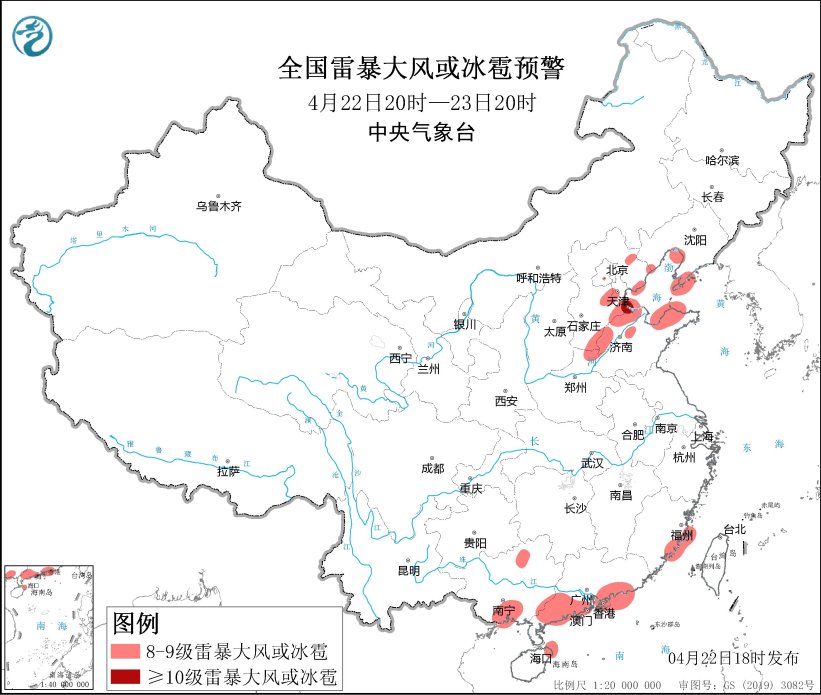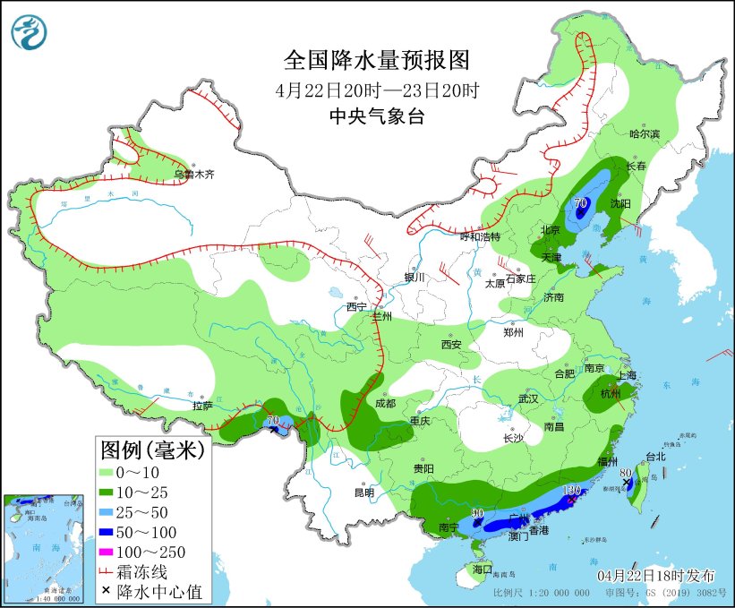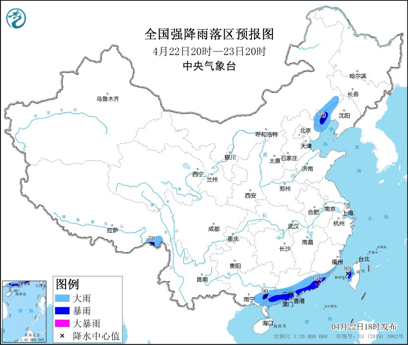未來三天,江南南部、華南中東部、台灣島等地有大到暴雨,其中,廣東中東部、台灣島西北部等地部分地區有大暴雨。此外,22日夜間至23日白天,北京、天津、河北、山東、遼寧等地部分地區有中到大雨、局地暴雨,並伴有雷暴大風或冰雹等強對流天氣。