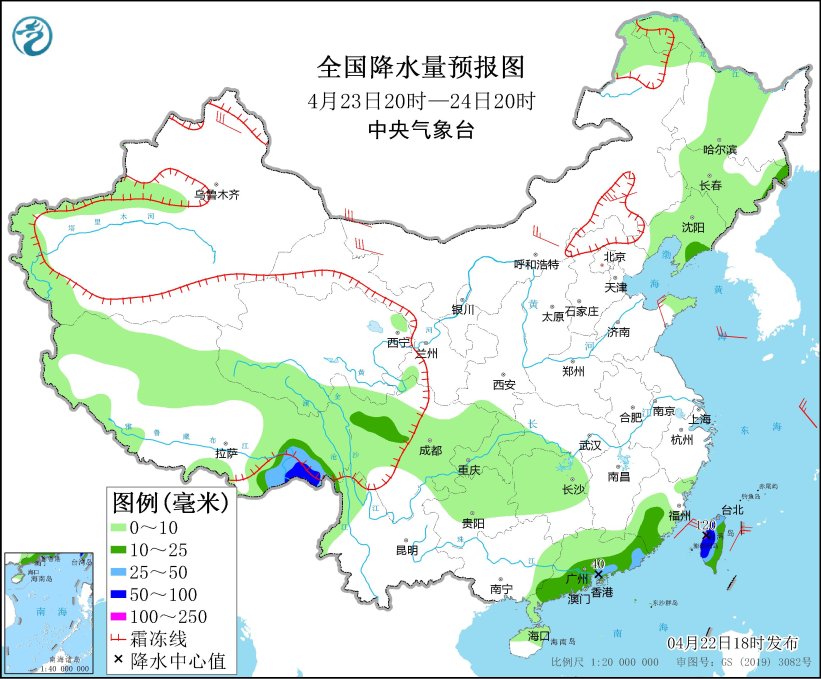 4月23日20時至24日20時,廣東南部、福建南部、台灣島等地有中到大雨,其中,台灣島西部部分地區有暴雨或大暴雨(100~120毫米)。新疆北部、內蒙古、山東東部等地部分地區有4~6級風(見圖4)。
