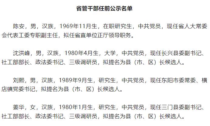 4月22日,微信公眾號“浙江發佈”發佈浙江省省管幹部任前公示通告。