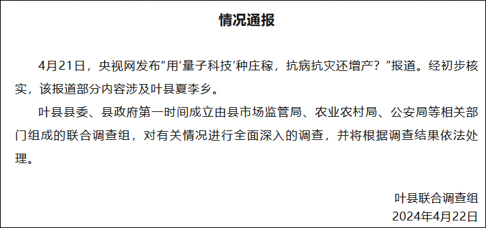 據河南省平頂山市葉縣融媒體中心微信公眾號“葉縣融媒”消息,4月22日,葉縣聯合調查組發佈情況通報稱,21日,央視網發佈“用‘量子科技’種莊稼,抗病抗災還增產?”報道。經初步核實,該報道部分內容涉及葉縣夏李鄉。
