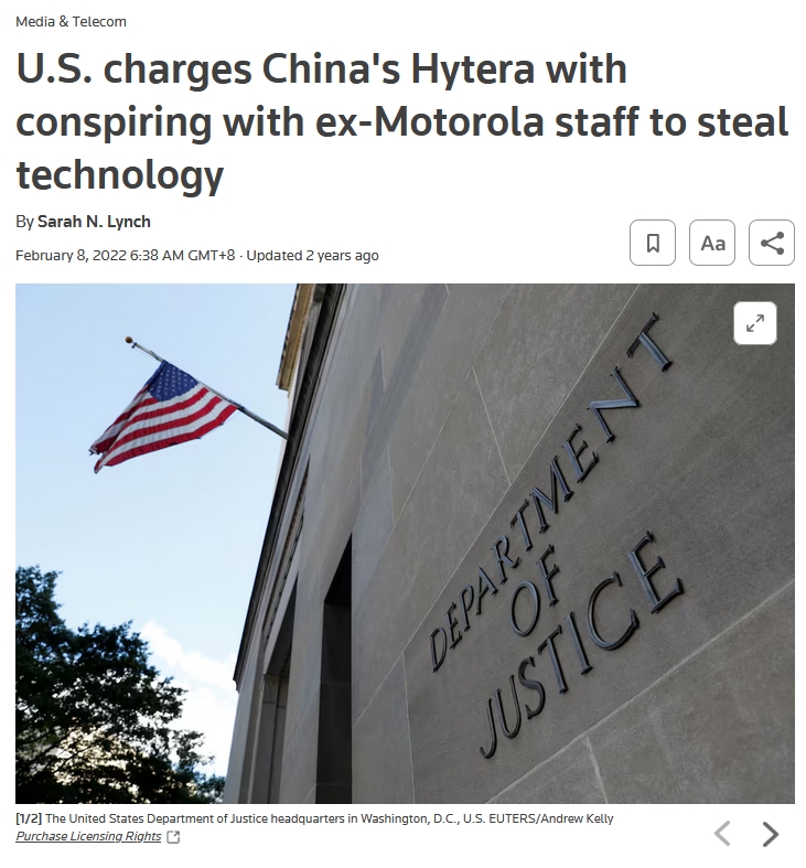 2022年2月8日,路透社報道稱美國指控海能達與前摩托羅拉員工合謀竊取科技專利
